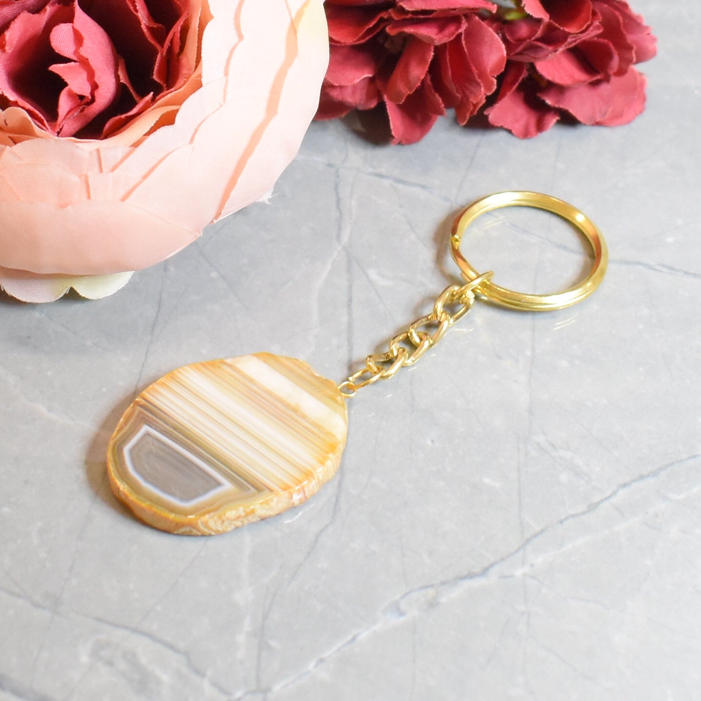 Agate Stone Keychain help to enhances mental function, improves concentration, enhances perception and analytical abilities. It is a soothing and calming gemstone that heals inner anger, anxiety and helps in the strengthening of relationships. Agate Stone instills security and safety.