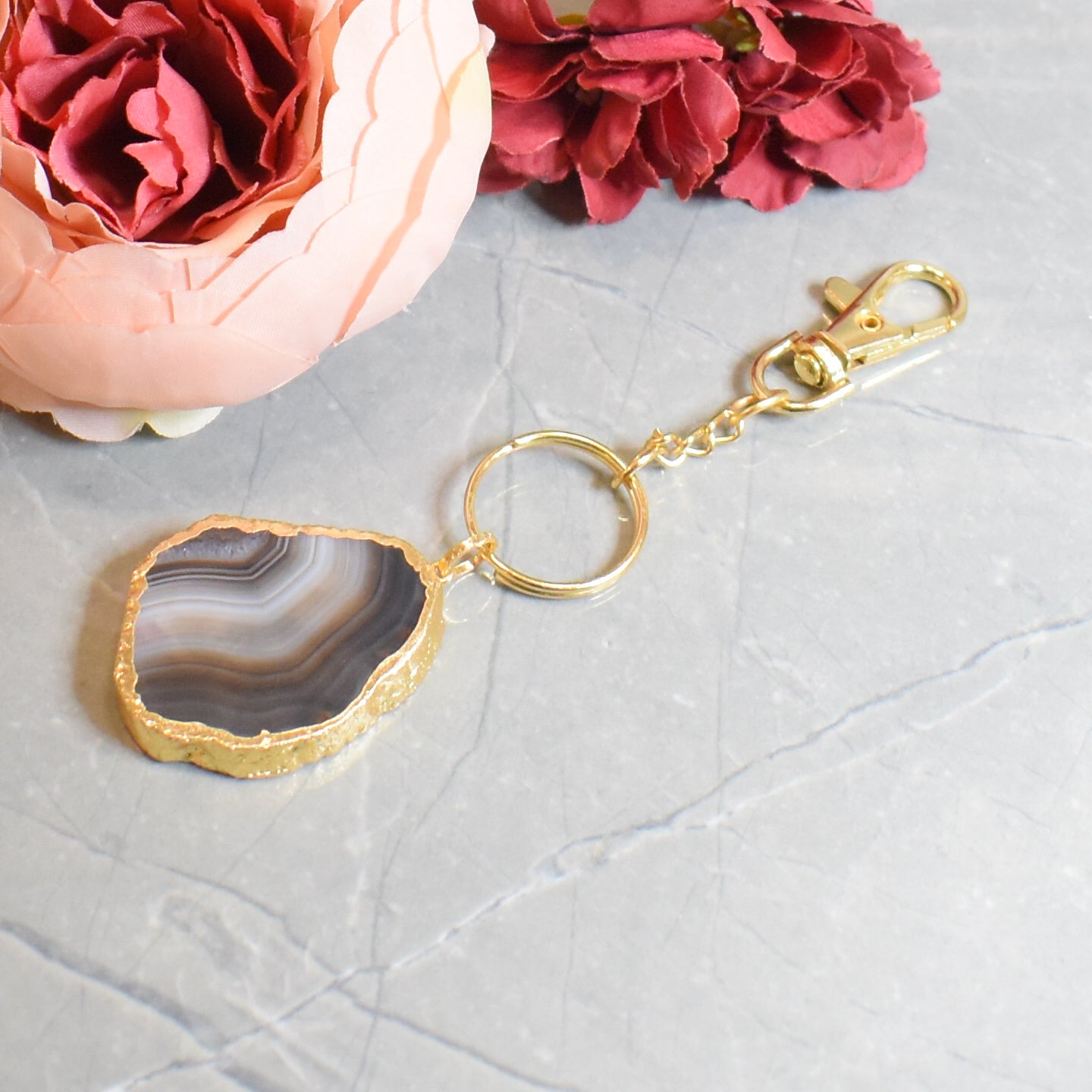 Agate Stone Keychain help to enhances mental function, improves concentration, enhances perception and analytical abilities. It is a soothing and calming gemstone that heals inner anger, anxiety and helps in the strengthening of relationships. Agate Stone instills security and safety.