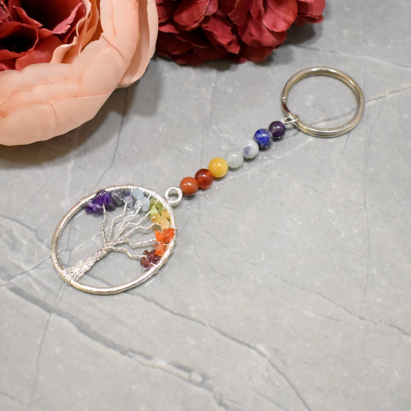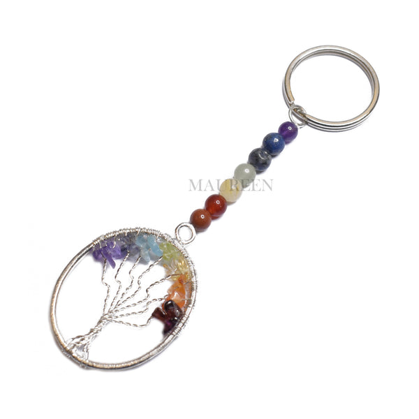 Maureen Natural 7 Chakra Stone Beads Keychain with Tree Of Life In Oval Shape Key Ring for Good Luck and Prosperity