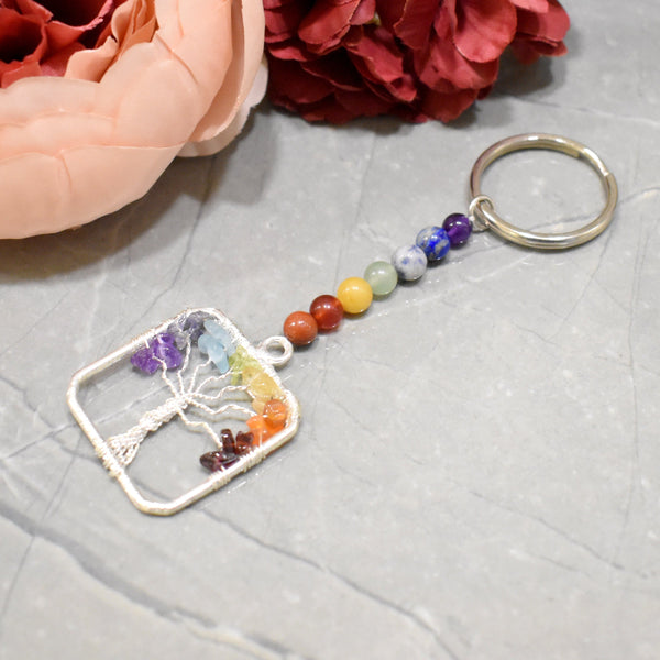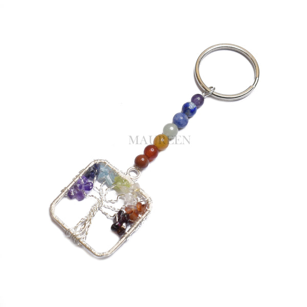 Maureen Natural 7 Chakra Stone Beads Keychain with Tree Of Life In Square Shape Key Ring for Good Luck and Prosperity