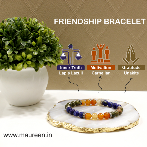 Maureen Natural Friendship Mix Stone Bracelet combination of 3 Magical Stone Unakite, Lapis Lazuli & Carnelian for Men & Women. Unakite is said to be a stone of vision, opening the third eye and useful for scrying. It is also believed to be a stone of balance,...