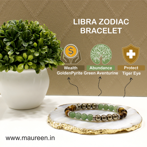 Maureen Natural Libra Zodiac Bracelet combination of 3 Magical Stone Tiger Eye, Green Aventurine & Pyrite for Men & Women. Tiger eye gemstone is associated with the solar plexus chakra. Because of that, it is believed that the wearer can expect positive effects on its metabolism, digestive...