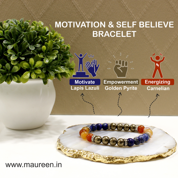 Maureen Natural Mix Stone Motivation and Self Believe Bracelet combination of 3 Magical Stone Carnelian, Pyrite & Lapis Lazuli for Men & Women. Carnelian can help to stimulate the muscles and allow oxygen to flow smoothly within the body. Pyrite has long been valued as a strong...