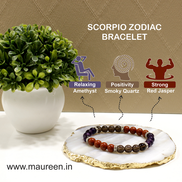 Maureen Natural Scorpio Zodiac Bracelet combination of 3 Magical Stone Amethyst, Red Jasper & Smoky Quartz for Men & Women. Amethyst is a protective stone that helps to relieve stress and anxiety in your life, and the symptoms that accompany it, namely headaches, fatigues, and anxiety. Red Jasper...