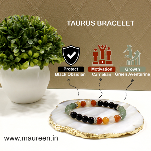 Maureen Natural Taurus Zodiac Bracelet combination of 3 Magical Stone Green Aventurine, Black Obsidian & Carnelian for Men & Women. Carnelian stones are believed to be great for balancing body energy levels, increasing coordination during physical exercise regimes, and as training aids. Green aventurine is a crystal for grounding...