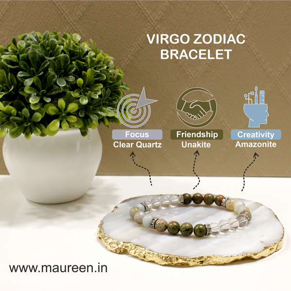Maureen Natural Virgo Zodiac Bracelet combination of 3 Magical Stone Amazonite, Unakite & Clear Quartz for Men & Women. Amazonite is said to have a soothing effect on the nervous system. Since the nervous system controls our emotions a great deal, this stone is said to soothe...