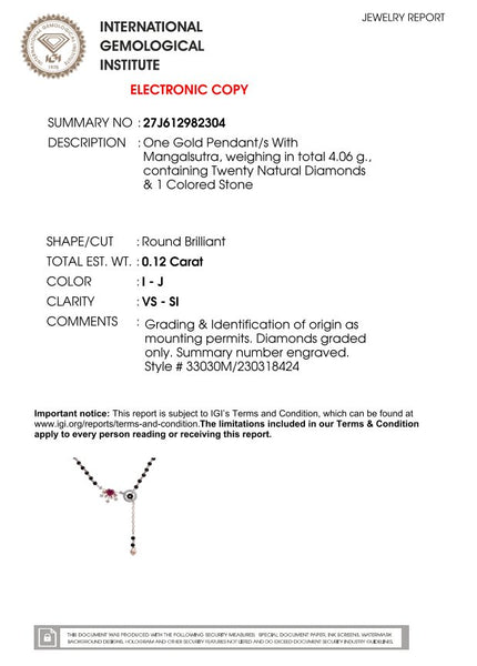 The Maureen Rose Gold Diamond Mangalsutra features a stunning blend of elegance and sophistication, crafted with premium diamonds set in a warm rose gold design. Perfect for adding a touch of luxury to any occasion. Gross Weight - 4.060 Net Weight - 2.788 Diamond Weight...