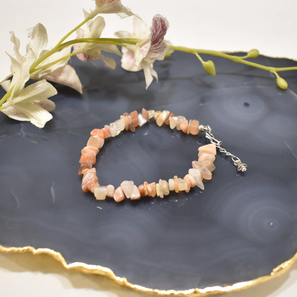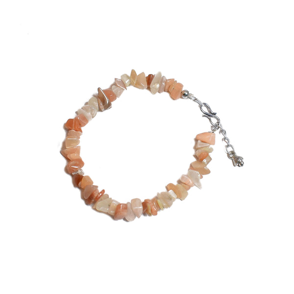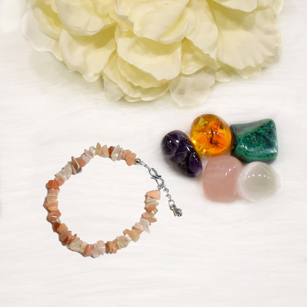 "Natural Pink Moonstone Chips rakhi will make him more affectionate and help him repress feelings of anger and jealousy. Moonstone enhances intuition, promotes inspiration, success and good fortune in love and business matters. Moonstone aids the digestive system, assimilates nutrients, eliminates toxins and fluid retention...
